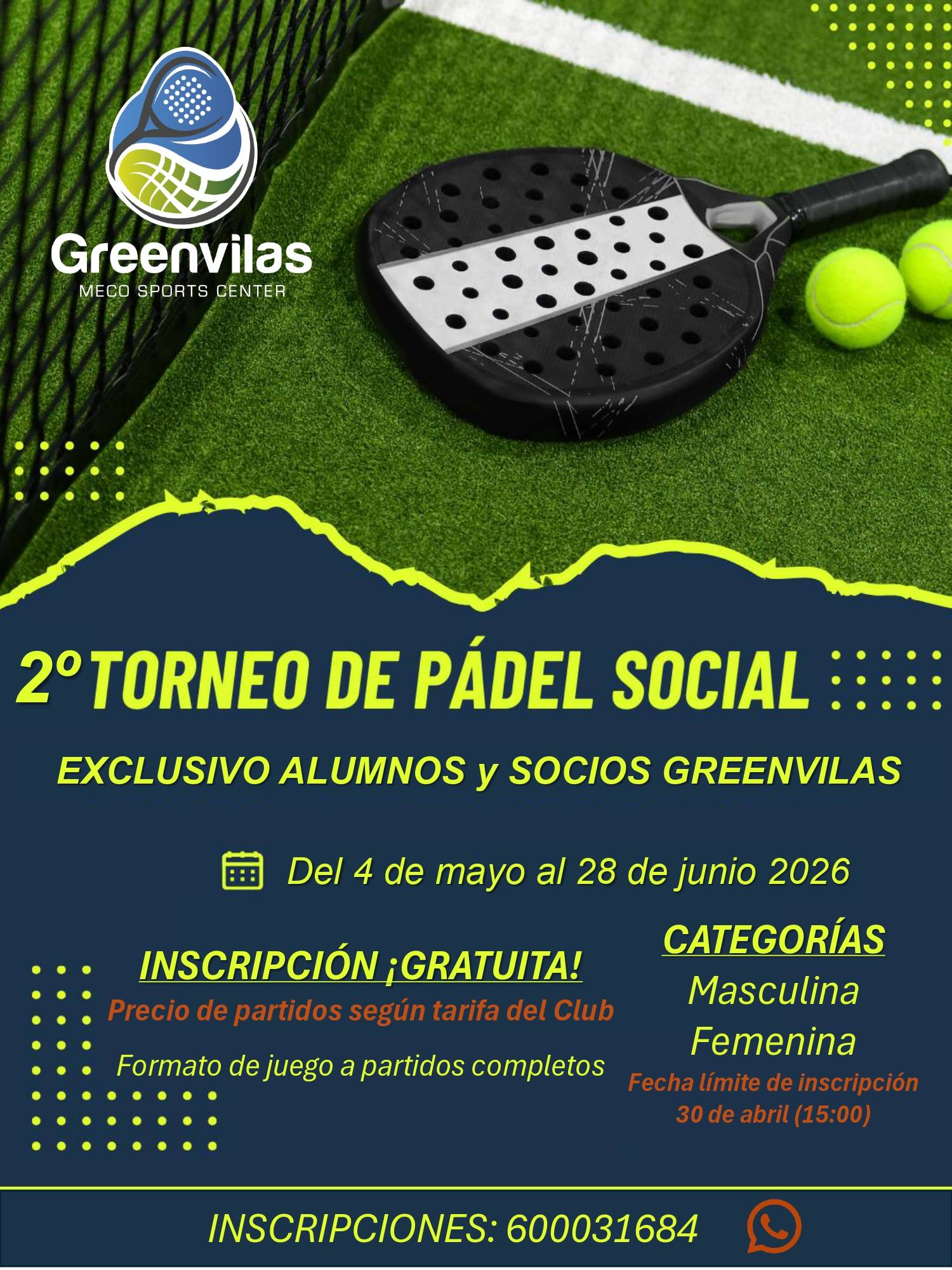 El PRIMER PASO ha sido generar 2 grupos de What's App (uno masculino y otro femenino) que servirán EXCLUSIVAMENTE para poder agrupar a aquellos jugadores/as de Pádel que jueguen en Greenvilas (independientemente de su nivel de juego) y quieran participar en partidos que se organicen de su nivel.