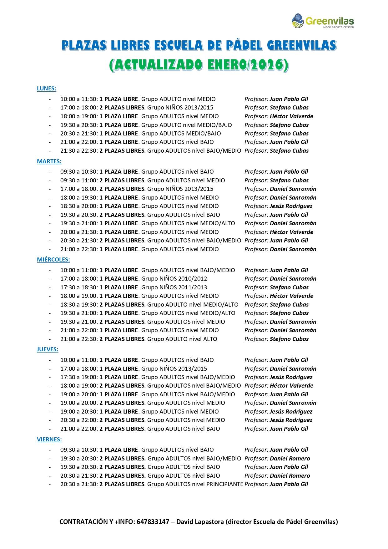 PLAZAS LIBRES ENERO 2026. ESCUELA DE PÁDEL